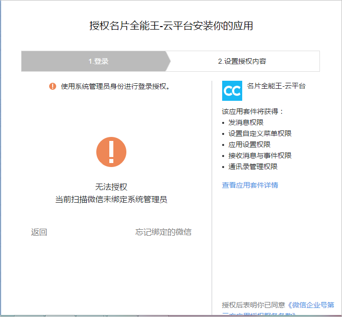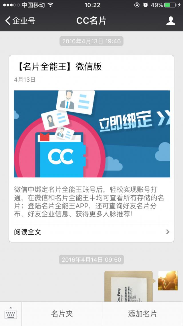 CC名片是名片全能王为微信企业号用户提供的企业号插件,企业管理员可以通过wx.cc.co登录授权并一键安装CC名片。安装后即可享受扫描名片、